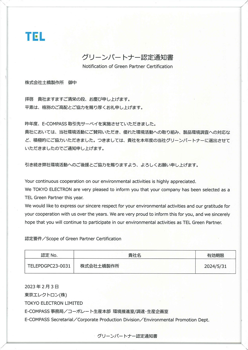 グリーンパートナー認定企業に選ばれました 2023/02/03 東京エレクトロン株式会社様より、環境活動への取組み及び製品環境調査への対応を評価いただき、2023年2月「グリーンパートナー企業」に認定されました。 今後も環境負荷低減活動に積極的に貢献してまいります。 「受賞・表彰」の一覧 2023/06/28 「2022年度 優秀取引先表彰」を受賞しました 2023/02/03 グリーンパートナー認定企業に選ばれました 2022/12/13 エクセレントパートナー賞を受賞しました 2019/06/07 お客様より「2019 SUPPLIER SPECIAL AWARD」を受賞しました 2017/06/05 お客様より「優秀取引先表彰」を受賞しました 2016/06/10 お客様より「2016 SUPPLIER SPECIAL AWARD」を受賞しました